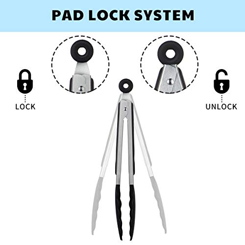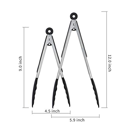iNeibo Kitchen Tongs, Pack of 2-Size 9 & 12 inch Food Tongs Non-Slip 1mm Thick Stainless Steel Handle Smart Lock Clip Heat Resistant Silicone Tongs, for Cooking, Serving, Barbecue, Buffet, Salad, Ice
