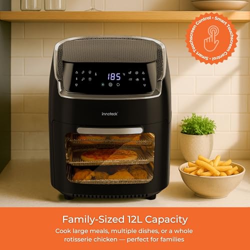 - 12L DIGITAL AIR FRYER OVEN WITH PRESETS – This Innoteck air fryer oven with rotisserie delivers 8 preset cooking modes for fries, meat, fish, shrimp, chicken, rotisserie, bake, and dehydrate. It supports large-capacity air frying and multi-mode air oven cooking, making it ideal for families or batch meals with less oil.