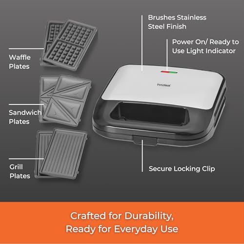 Innoteck Kitchen Pro 3 in 1 Snack Maker – Sandwich, Waffle & Grill Plates | 750W, Non-Stick Detachable Plates, Easy Clean, Compact Storage, Thermostat, Cool-Touch