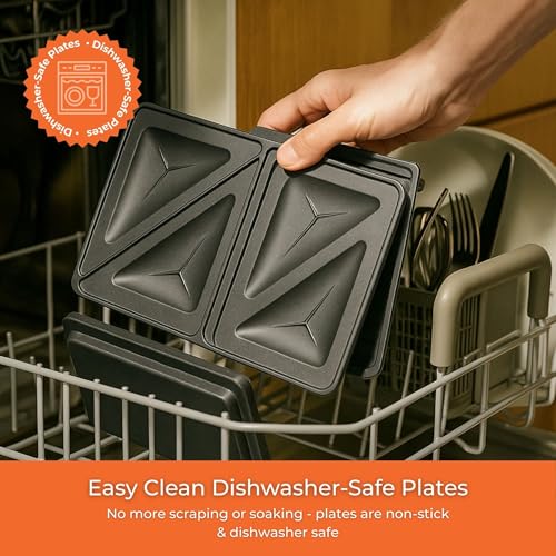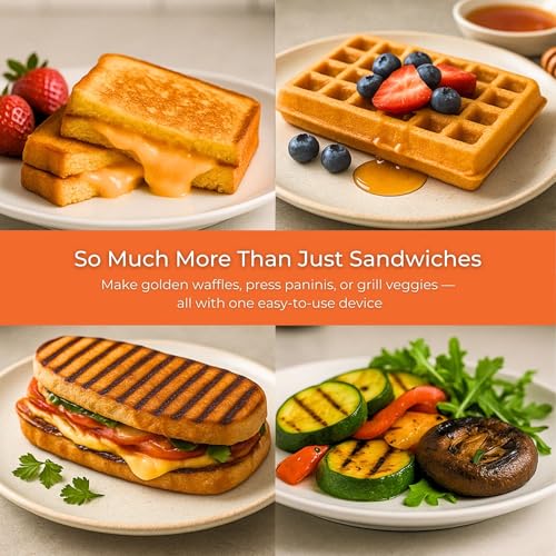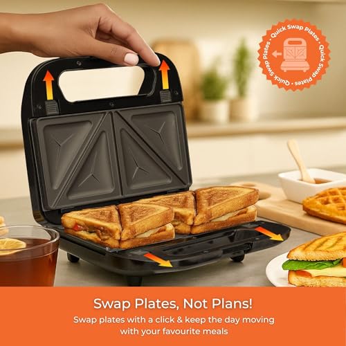 - USER-FRIENDLY: Perfect for making Grilled sandwiches, paninis, and toasties, Belgian-style waffles, Grilled veggies, meats, and more. It comes with 3 interchangeable non-stick plates (grill, waffle, sandwich). Main snack maker unit and User manual