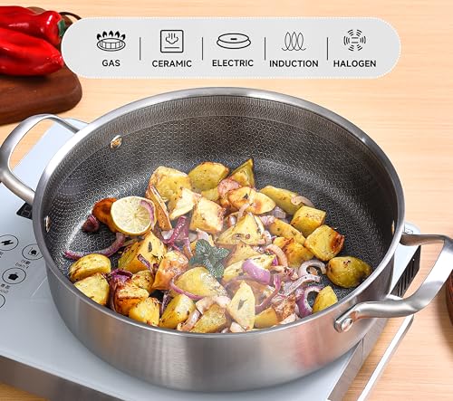 Inqibee 3 QT Hybrid Tri-Ply Stainless Steel Non Stick Sauté Pan with Lid, 26 CM Induction Deep Frying Pan, Skillet, Jumbo Cooker, Oven Safe