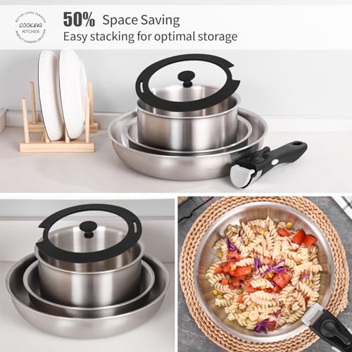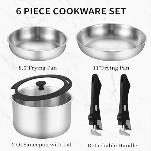 Inqibee Tri-ply Stainless Steel Detachable Handle Pan Set 6 pcs,Compatible with All Stoves,Induction & Oven Safe, Stackable cookware Set Ideal for Small Kitchen storages