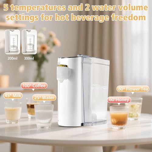 • 5 Temp and 2 Volume Settings: The countertop water dispenser offers 5 temperature options (room temperature/45℃/60℃/80℃/100℃) and 2 volume settings (200ml/300ml) to suit your needs.