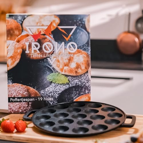 IRONO Poffertjes Pan – Mini Pancake Maker – Pancake Pan – 19 Mini Pancakes – Eggs Crepe Pan – Cast Iron – Includes Brush, Turning Fork, Batter Bottle, 6 Forks, Handles