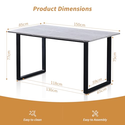 JaHECOME 150cm Dining Table Grey Marble Effect Top for 4-6 People Kitchen Table with Sturdy Metal Legs U-Shape(150 x 85 x 75)