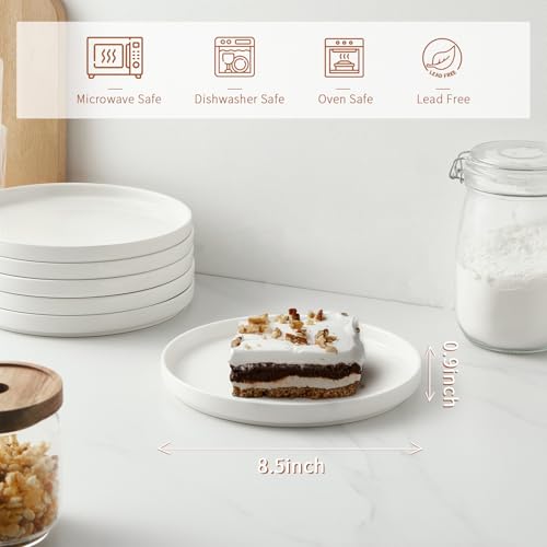Jassceram 8.5 Inch Small Dinner Plates Set of 6, Ceramic Flat Plates for Salad, Dessert and Appetizer – Microwave, Oven and Dishwasher Safe, Scratch Resistant & Lead-Free, High Edge Dish Set, White