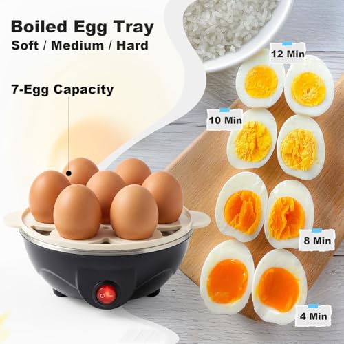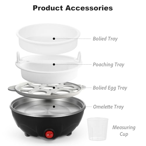 - Multifunctional 3-in-1 Design: This high-quality electric egg cooker combines boiling eggs, poaching eggs, and steaming vegetable omelets in one unit. It features a removable 7-egg capacity steamer rack, a divided steamer rack, a measuring cup, and a steaming tray, allowing effortless preparation of family breakfasts and healthy snacks.