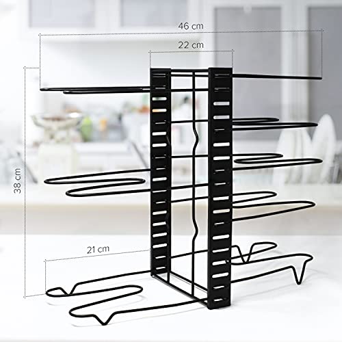 - Adjustable Tiers – Can hold up to 8 pots, pans, trays, & other kitchenware of all sizes unlike inconveniently fixed pot racks. This pan organiser for cupboard can be assembled in minutes without the need for screws or added tools.