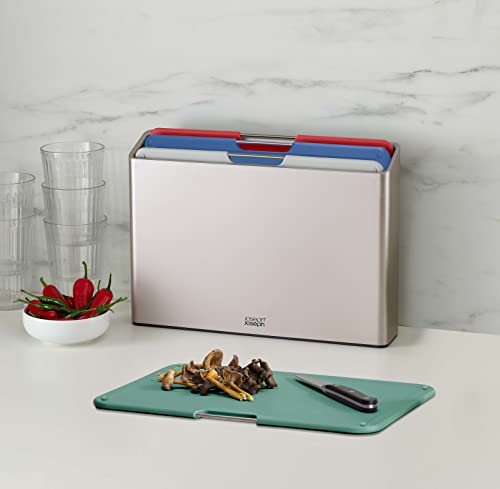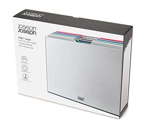Joseph Joseph Folio Set of 4 Chopping Board Set, Slimline case for organised storage, Large- Silver/Coast