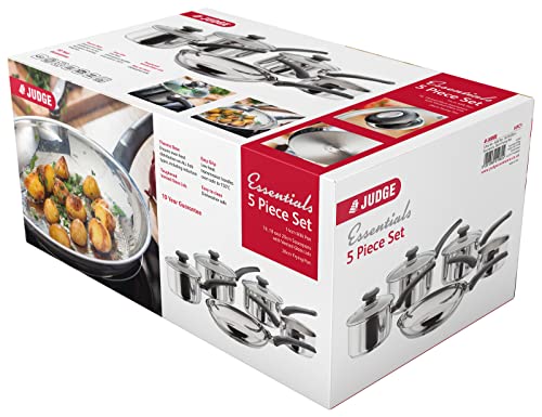 Judge Essentials Stainless Steel Set of Pans, 5-Piece Set, 14cm Milk Pan, 26cm Frying Pan, 16cm, 18cm & 20cm Saucepans with Vented Glass Lids, Induction Ready, 10 Year Guarantee