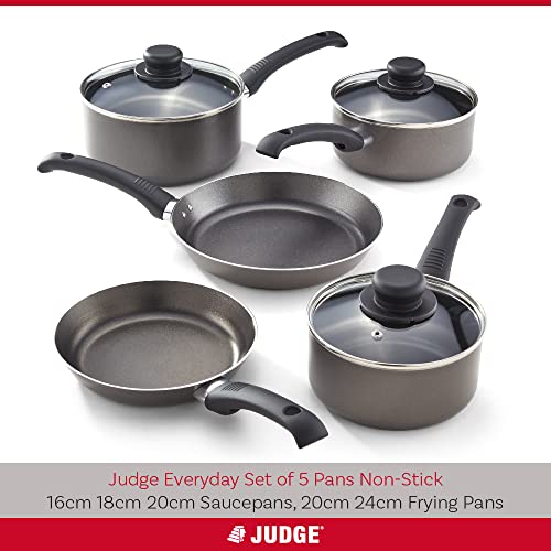 Judge Everyday 5 Piece Cookware Set, Non-Stick Pot Set, 5-Pieces 16cm 18cm 20cm Saucepans, 20cm 24cm Frying Pans, Aluminium Pots with Heat Resistant Handles, Not Suitable for Induction Hobs