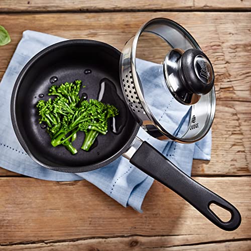 Judge Vista Draining Set of 5 Stainless Steel, 16cm 18cm 20cm Saucepans with Pouring Lip and Strainer Lids, 14cm Milk Pan, 26cm Non-Stick Frying Pan, Induction Ready, Oven Safe