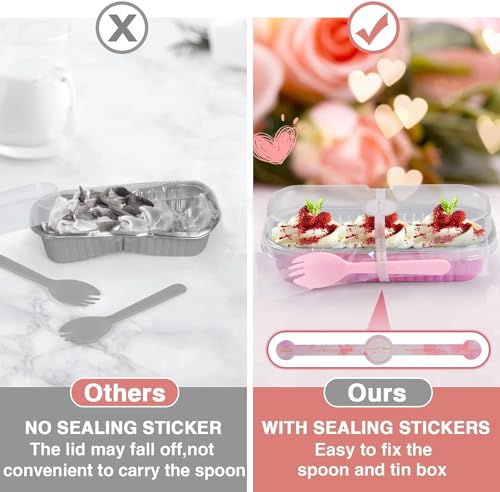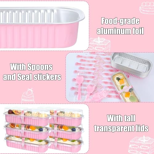 KAHEIGN 50Pcs Mini Loaf Pans with Lids and Spoons, 200ml Rectangular Aluminum Foil Baking Pans Mini Cake Tins Containers with Sealing Sticker for Bread Cake Wedding Birthday Picnic Party (Pink Silver)