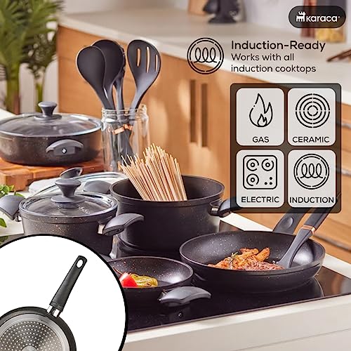 • Comprehensive 13-Piece Cookware Set: The Karaca Biogranite Induction Base Cookware Set consists of a well-rounded collection, including an 18 cm (2 L) stockpot with a lid, a 22 cm (3.5 L) stockpot with a lid, a 26 cm (3 L) casserole with lid, a 26 cm frying pan, a 18 cm shallow pan and utensil set. It provides all the essential cookware pieces needed for day-to-day cooking, making it a versatile addition to your kitchen.
