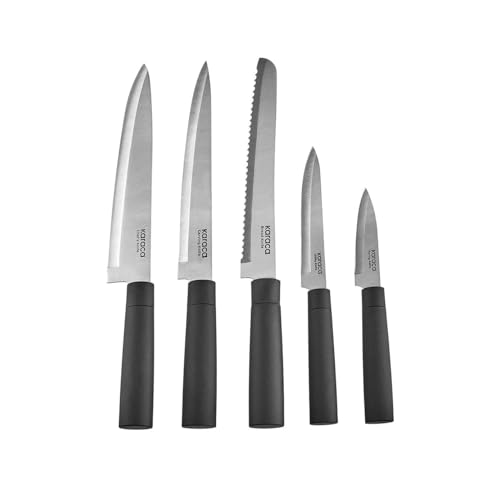 - Complete Knife & Serving Set: This impressive collection features a chef knife (32.4cm / 12.75"), a slicing knife (32.4cm / 12.75"), a bread knife (32.4cm / 12.75"), a vegetable knife (23.8cm / 9.37"), a paring knife (20cm / 7.87") and 1 block. Also, 3 spoons and a soup spoon, a strainer, a slotted spatula, a spatula, a whisk, and an egg brush. This set is practical for everyday kitchen use and adds a touch of elegance to your cooking space.