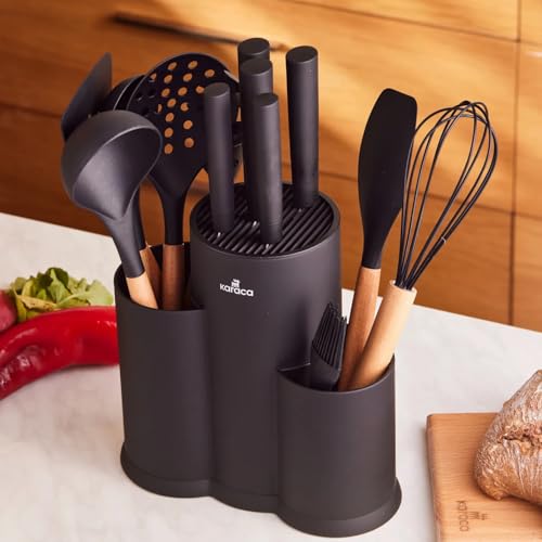 Karaca Burby 14-Piece Kitchen Knife Set with Block & Kitchen Utensil Set with Holder & Wooden Handles, Chef, Slicing, Bread Knives & Essential Cooking Tools, Black