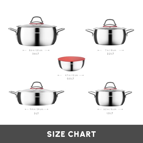 Karaca Emirgan XL Stainless Steel Induction Cookware Set, Pot and Pan Sets with Container, 10 Piece, Silver Red