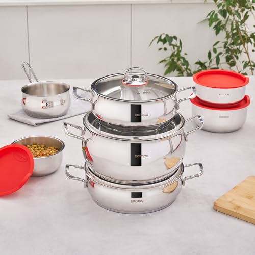 Karaca Stainless Steel Cookware Set 13-Piece, Saucepan, Pot Set, Induction Kitchen Cooking Set for Daily Cooking, Elegant Silver Finish Pots and Pans Set