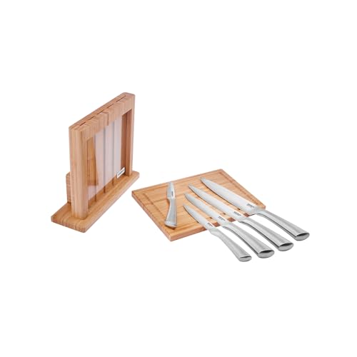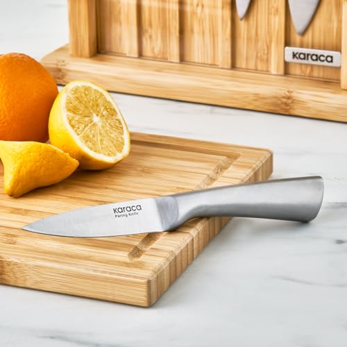 Karaca Vigor 7-Piece Stainless Steel Knife Set with Block & Cutting Board, Silver Kitchen Knives Sets with Ergonomic Handles, Includes Chef's, Slicer, Bonning, Utility, Paring Knives & Bamboo Stand