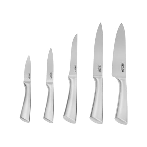 - Complete Knife Set: This impressive collection features a chef knife (20cm / 7.87"), a carving knife (20cm / 7.87"), a bone knife (15cm / 5.90"), a vegetable knife (13cm / 5.11"), a paring knife (9cm / 3.54") and 1 block. This set is practical for everyday kitchen use and adds a touch of elegance to your cooking space.