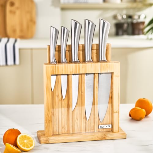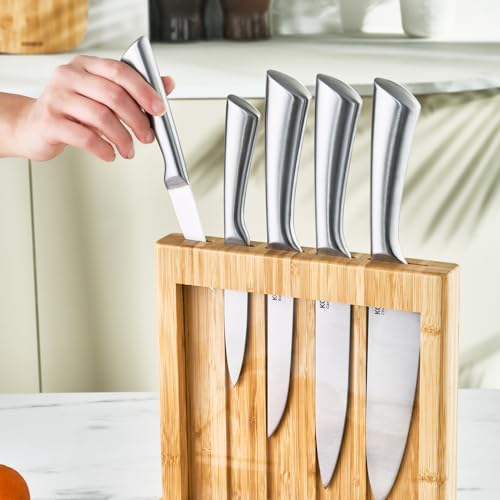- Versatile Knife Set: Includes stainless steel knives stored in a stylish wooden block. The block is made of bamboo and is designed to hold the knives vertically for easy access and storage, includes various knife types for different kitchen tasks, such as slicing, chopping, and paring.
