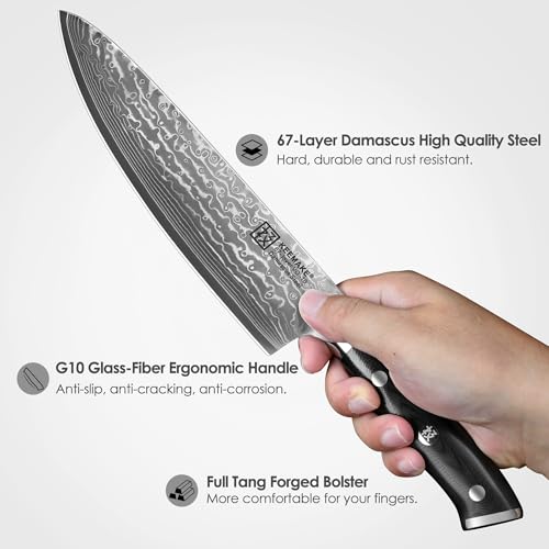 KEEMAKE Damascus Chef Knife 8 Inch – Sharp Japanese Knife with Premium Damascus Steel VG-10, 67 Layers Blade Professional Kitchen Knives with Ergonomic G10 Handle