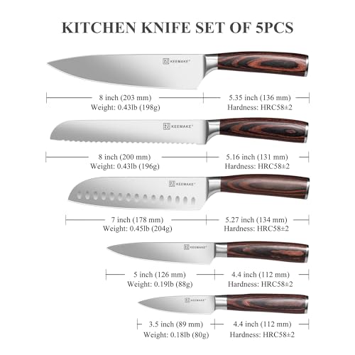 - Versatile Kitchen Knife Set: The KEEMAKE 5-piece knife set includes an 8" chef knife, 8" bread knife, 7" Santoku knife, 5" utility knife, and 3.5" paring knife, making it perfect for all your kitchen tasks—chopping, slicing, dicing, and more. Ideal for both home chefs and culinary enthusiasts!