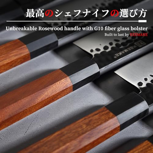 • PREMIUM MATERIAL: KEEMAKE KIKU series Japanese chef knife is crafted out of premium Japanese 440C high carbon stainless steel with 58 HRC and have the effect of increasing strength (sharpness and abrasion resistance) and sticky (hard to chip). Recommend Japanese 440c steel Japanese knife because of their characteristics: ease of re-sharpening, good durability and rust resistance, and edge retention