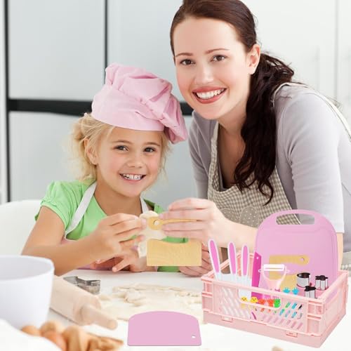 【Kids Kitchen Knife Set】include 4 toddler knife set, 1 Crinkle Cutter, 1 wooden knife, 1 foldable box,1 Peeler, 4 cutting molds, 1 cutting board, 1 Dough cutter, 10 Fruit fork. kids cooking set can increase the fun of playing in the children’s kitchen and are suitable for girls and boys from 4 5 6 7 8 years.