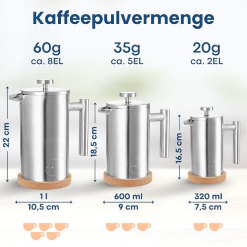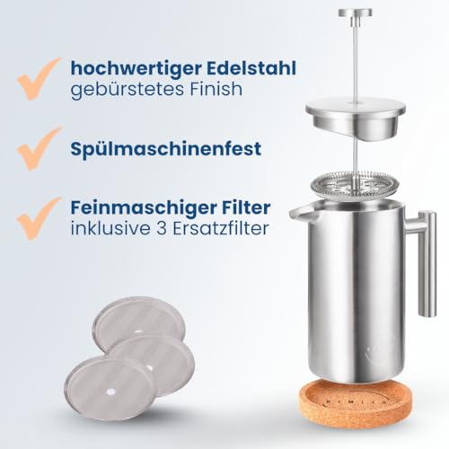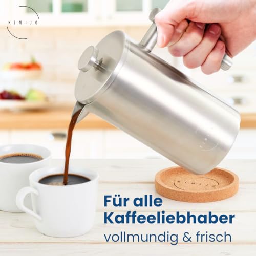 KIMIJO® French Press Coffee Maker, Brushed Stainless Steel, Includes 3 Replacement Filters & Cork Coasters, Double Walled with Warming Function, 0.60 Litres, 3 Cups