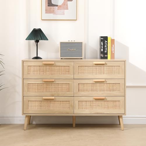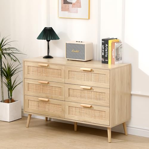 Kingwudo® Wooden and Weave Chest of Drawers with 6 Drawers 6 Dresser Cabinet Tables Storage Cabinet Organizer Unit Cupboard Drawers Chest for Bedroom Furniture,Living Room,Kitchen