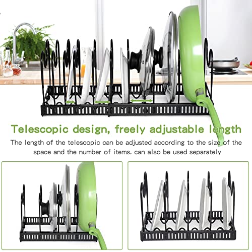 - 【Easy to Install】 our kitchen pan holder is easy to assemble. You can assemble them in minutes without tools. It can be used as a separate adjustable pot lid holder and can also be divided into 2 independent pan organizers for separate use to better adapt to the kitchen space.
