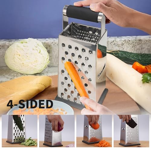 - 4-Sided Grater for Kitchen Needs: This box grater features four different grating surfaces for fine, medium, coarse grating, and slicing. It's ideal for shredding cheese, slicing vegetables, or zesting lemons.