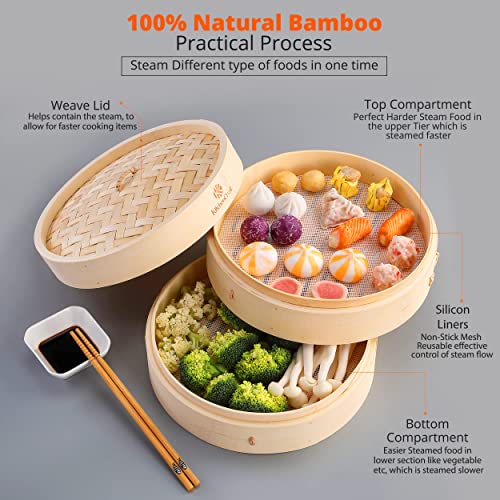 KITCHEN CRUST Bamboo Steamer Basket for Chinese Asian Cuisine, 2-Tier 10-Inch Steaming Basket, Bao Bun Vegetable & Dumpling Steamer, Sauce Dish, Reusable Liners, Ring