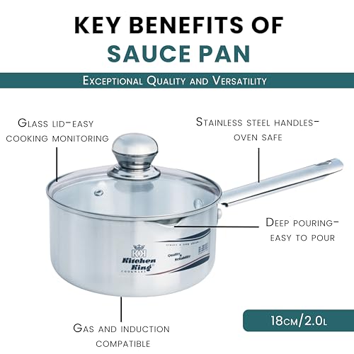 - The Ultimate Culinary Collection: Meet the Kitchen King Kingdom Pots and Pans Cooking Set, an 11-piece collection designed to cater to all your culinary needs with elegance and efficiency. This comprehensive set includes four casserole dishes with lid sizes ranging from 18cm to 26cm, each paired with a glass lid, a versatile 18cm saucepan with a glass lid, and a 24cm frying pan. Ensuring moisture control while keeping an eye on your culinary creations.Whether you're simmering, sautéing, or frying, this set has you covered.