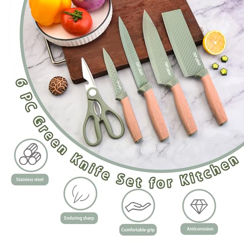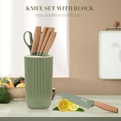 Kitchen Knife Set, 6 Pieces Green Professional Knife Set with Universal Knife Block, Super Sharp Knife Sets with Ergonomic Handle, Non-Stick Stainless Steel Knife Block Set