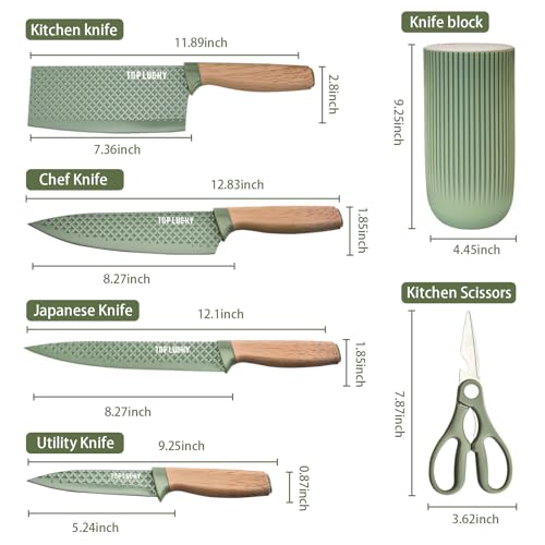 - 【Practical 6 Piece Knife Set】Including 12" kitchen knife, 12.6" chef's knife, 12.8" japanese knife, 9.3" utility knife, 7.9" kitchen scissors, 9.3" universal knife block.They can meet all your cutting needs, and the universal knife block can store the entire set of knives, ensuring the cleanliness of your kitchen countertop.