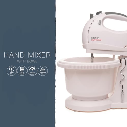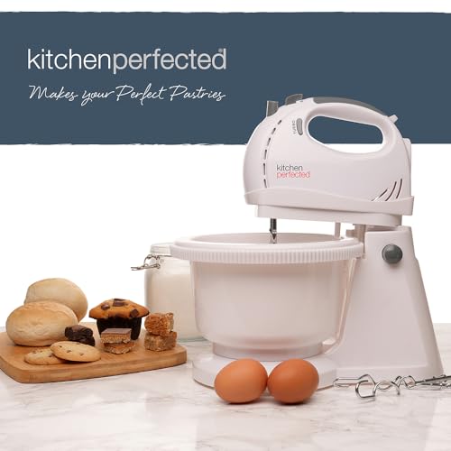 Kitchen Perfected Electric Stand Mixer with Bowl, 2L, 300W, Tilting Stand and Whisks and Dough Hooks, 5-Speed Hand Mixer with Turbo Function – E5434WH