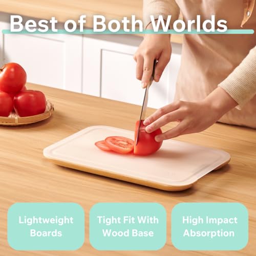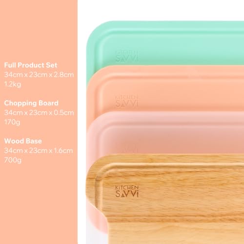 KitchenSavvi 4-in-1 Medium Chopping Board Set With 3 Stackable Plastic Boards: Dishwasher Safe | Lightweight & Ergonomic | Space Saving Storage | Hygienic & Modular Design | Thick & Durable Rubberwood