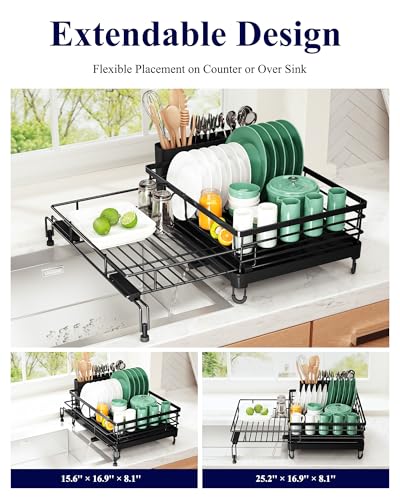 - RUST-RESISTANT MATERIAL: Made from rust-resistant metal combined with plastic, this extendable dish drainer rack offers long-lasting durability. Its reinforced structure and base feet with silicone rings provide excellent stability, so you can rely on it for everyday use while keeping your kitchenware safe and well-supported.