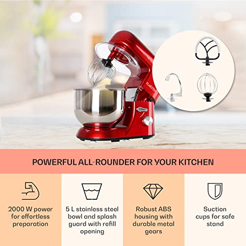 Klarstein Bella – Stand Mixer, Mixer, Food Mixer, 1300W, 5l Stainless Steel Bowl, 6 Speed, Range of Accessories, Keyless Chuck for Tool Holder, Easy to Operate – Red