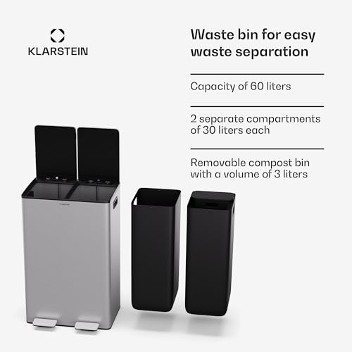 KLARSTEIN EcoVista Kitchen Bin – 60L Waste Separation with 3L Compost Bin, Soft-Close, Stainless Steel, Removable Compartments, Modern Design