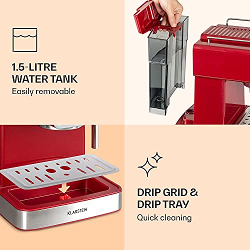 KLARSTEIN Gusto Classico Espresso Maker – Espresso Machine, Portafilter Machine, Power: 1350 Watts, 20 Bar Pressure, Water Tank Volume: 1.5 Litres, Removable Stainless Steel Drip Grid, Colour: Red
