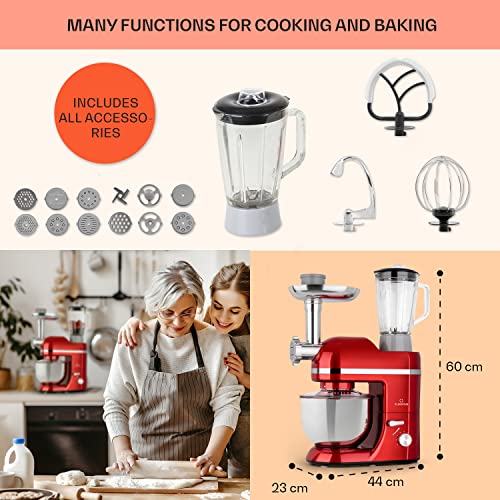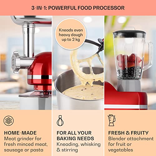 Klarstein Lucia Elegance – Stand Mixer, Food Processor and Blender, Meat Grinder, 1800 Watts in 6 Power Levels, Pulse Function, 5 l Stainless Steel Bowl / 1.5 l Glass Mixer Jug, Red