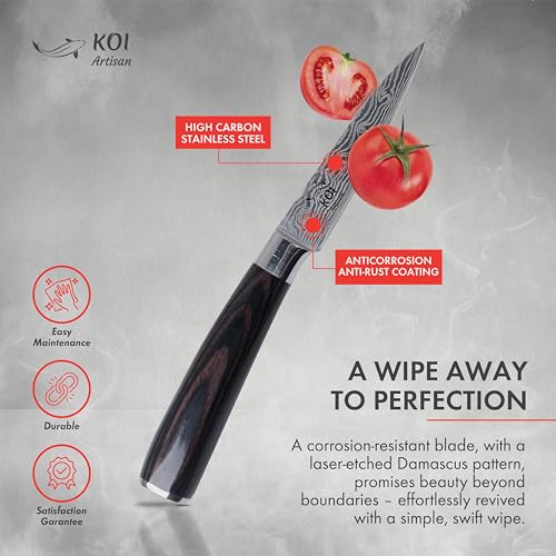 KOI ARTISAN Damascus Style Paring Knife – 3.5 Inch Razor Sharp Edge – Chef Knife High Carbon Stainless Super Steel – Moisture Resistant Pakka Wood Handle Kitchen Knives