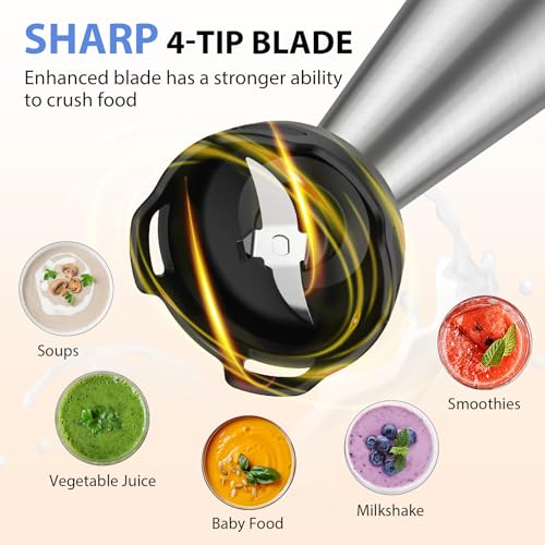 - 1000W MOTOR & 4 PRONG 304 STAINLESS STEEL BLADE – Compared with other 300-500W motors, KOIOS upgraded hand blender is equipped with a 1000W copper motor, which is more powerful and has a stronger capacity for crushing food. With food-grade 304 stainless steel blades, this material has good oxidation resistance and high temperature resistance. Safe to use even in hot soup.