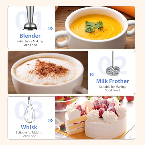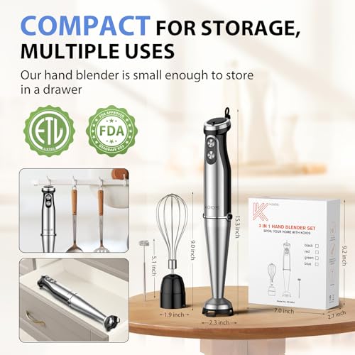 - EASY TO CLEAN & BPA FREE – KOIOS hand blender is detachable and washable. Accessories can be submerged in water or placed in the dishwasher for cleaning (except engine parts). All parts in contact with food comply with the strictest laws and regulations, making it safer and healthier to use. It is the best choice to give friends or family gifts.