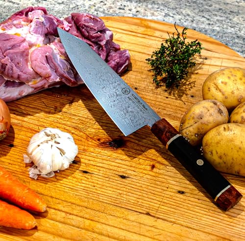 - OCTAGONAL WOOD HANDLE: Crafted from ebony and knurled burl wood, the handle balances elegance with grip. Its octagonal shape — a traditional feature in Japanese knives — offers natural indexing, letting your fingers find the right position instinctively. It’s designed for control, comfort, and lasting balance in motion. This is a premium knife, built to feel as good as it looks — for chefs who notice the details.