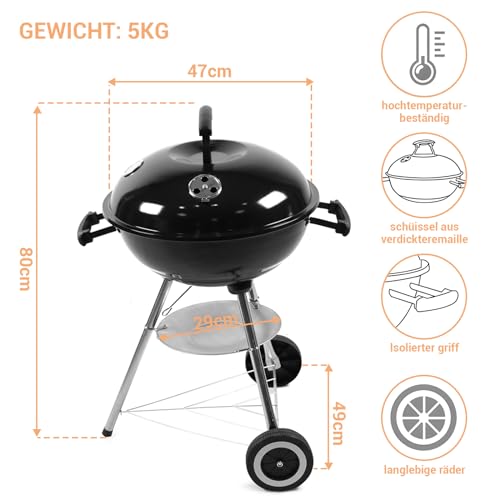 - Durable material: the kettle grill is made of coated steel material, the insulated handle is made of heat-resistant nylon, the charcoal bowl, the grate and the lid are enamelled, and the hotplate is made of galvanised steel, making the whole thing durable and easy to clean.