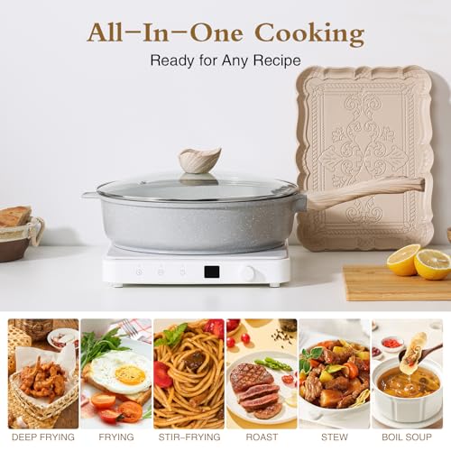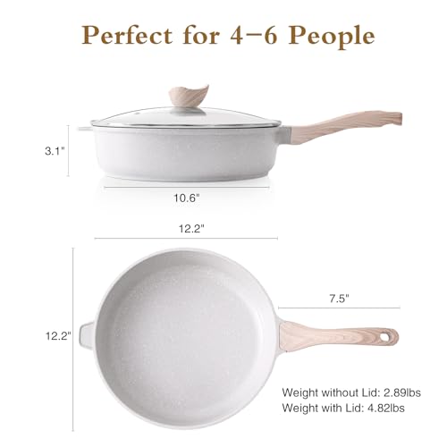 - 【Versatile Saute Pan with Lid】: Experience the convenience of our 12" diameter, 3.2" height, and 5 quarts capacity ceramic cookware; this large and deep skillet, also functioning as a deep frying pan and induction frying pan, is perfect for stir-frying, frying, boiling and deep-frying a variety of dishes with ease